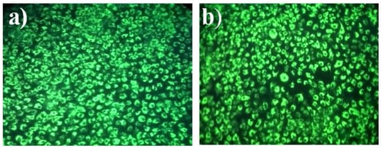 Biocompatibility of HEK-239 cells with AuNPs under fluorescence microscope evidenced by Trypan blue exclusion and AO/EB staining. (a) Control cells appear green with no evidence of cell death. (b) Cells treated with AuNPs (100 g/mL) appear similar to control cells. Reprinted with permission from Ref. [110]. Copyright 2019 Elsevier.