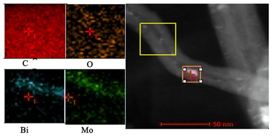 STEM images and elemental mapping of the elements O, C, Mo, and Bi of the 0.018 (BiMo)/CNTs catalyst.