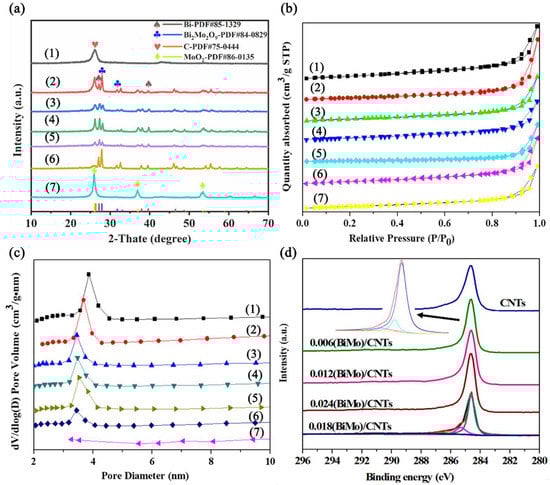 (a) XRD patterns of CNT catalysts with different compositions: (1) CNTs, (2) 0.006(BiMo)/CNTs, (3) 0.012(BiMo)/CNTs, (4) 0.018(BiMo)/CNTs, (5) 0.024(BiMo)/CNTs, (6) 0.024Bi/CNTs, and (7) 0.024Mo/CNTs; (b) N2 adsorption–desorption isotherms of CNT catalysts with different compositions; (c) their pore size distributions: (1) CNTs, (2) 0.006(BiMo)/CNTs, (3) 0.012(BiMo)/CNTs, (4) 0.018(BiMo)/CNTs, (5) 0.024(BiMo)/CNTs, (6) 0.024Bi/CNTs, and (7) 0.024Mo/CNTs; (d) XPS C1s of different catalyst samples.