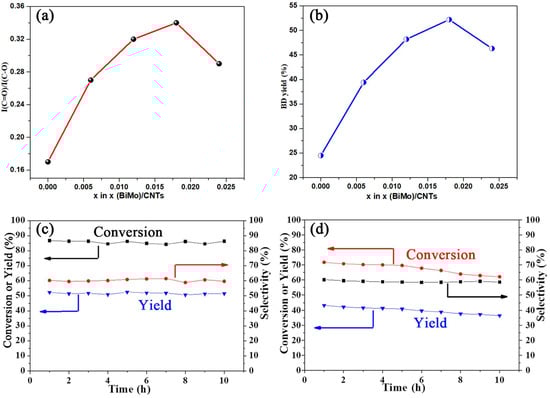 (a) I(C=O)/I(C−O) of CNT catalysts in x(BiMo)/CNTs, (b) the relationship of BD yield with respect to x in x(BiMo)/CNTs without water, the catalytic performance without water in the ODH reaction: conversion, yield in BD, selectivity to BD and CO2 for (c) 0.018 (BiMo)/CNTs (d) BiMo.