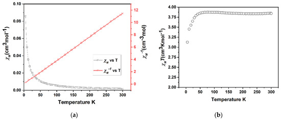 (a) A combined plot of the molar magnetic susceptibility (χM) and inverse magnetic susceptibility (χM−1) of FeL(BF4)2 (3) against temperature. (b) A plot of the magnetic susceptibility (χMT) vs. T per metalloligand. Both plots are indicative of the presence of HS (paramagnetic) Fe(II).