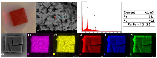 An optical microscope image and the scanning electron microscopy (SEM) photograph indicated that crystalline 1 undergoes rapid decay upon losing its solvent (Figure 4). In addition, scanning electron microscopy/energy-dispersive spectroscopy (SEM−EDS) analysis of cage 1 confirmed that the ratio of Fe(II) to Pd(II) in the cage is approximately 4:3 (Figure 4). Additionally, the EDS results confirmed the presence of C, N, F, Fe and Pd; the element maps indicated that each element was uniformly distributed as well as being chemically homogeneous (Figure 4).