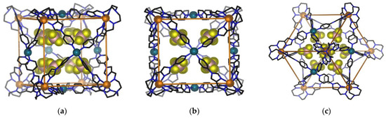 Schematic representation of the same view shown three ways for the single crystal X-ray diffraction structure of 1 encapsulating the BF4− anions within the void; (a) offset edge view of 1 (b) C4 axis view of 1; (c) C3 axis view of 1. The BF4− anions outside the cage, solvents and hydrogen atoms are not shown for clarity.