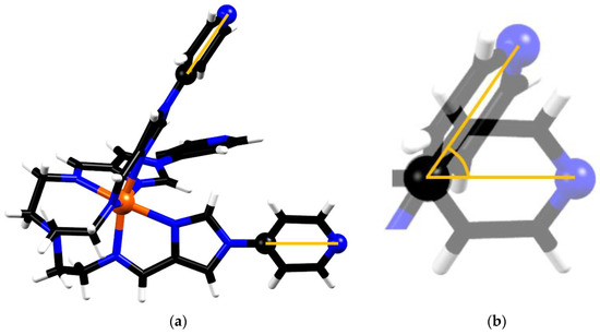 Representation of two selected mutually-positioned secondary group bonding axes in the metalloligand. (a) the intervals corresponding to the bonding direction of each of the secondary binding domains are highlighted, as defined by the coordinates of C9 and N4 in each arm of the metalloligand. (b) Since the bonding axes do not intersect, they are translated such that the reference C atoms in both ligand arms share the same point. The angle between axes can then be calculated.