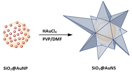 A schematic illustration of the SiO2@AuNS core–shell formation based on the coating of SiO2@AuNP in PVP/DMF in the presence of HAuCl4.