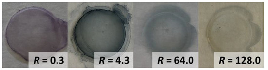 Colors of the synthesized gold nanostructures SiO2@AuNS immobilized on a glass substrate depending on the initial seed concentration. The color change indicated a red-shift of the plasmon band with increasing R.