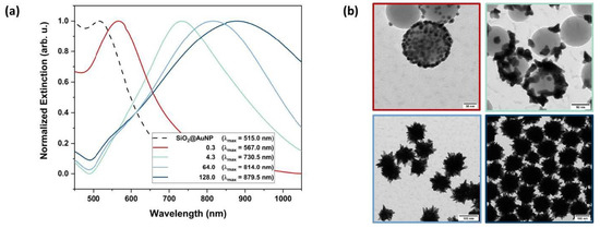 Corresponding TEM images of the nanostructures are presented in Figure 3b in order to monitor the actual shape of the formed nanostructure. By increasing R, the SPR bands exhibit a red-shift due to the growth of the gold nanostructure. Strong bathochromic shifts indicate the formation of sharp edges, which is well established for AuNS [24]. These growing steps of the gold nanostructures could be observed by TEM micrographs. High seed concentrations (R = 0.3, 4.3) only promoted the growth of AuNP but not the formation of a continuous crystalline metallic shell surrounding the SiO2-NP. Above a critical [HAuCl4]/[seed] mass ratio (Rmin) at circa 64.0, a core–shell structure was formed. Further variation in R leads to different sized SiO2@AuNS. Therefore, the average nanostructure diameters were determined from the TEM images. At a high SiO2@AuNP seed concentration, equaling low R, the AuNP diameter dAu increased from 3.9 nm initial seed diameter to 7.1 nm. The extinction spectra (Figure 3a, red line) show an equally shaped, slightly red-shifted SPR band compared to the initial seeds indicating the growth of gold nanospheres. For lower SiO2@AuNP concentrations, equaling higher R, an anisotropic growth occurs. When R is increased to a value of 4.3, branched nanostructures of 26.1 nm in diameter (green line) were formed. Extinction spectra and TEM images of three more nanostructures with R of 0.6, 3.2 and 12.8 line up perfectly in the trend shown here (see ESI Figures S4-1–S4-3). For R of 0.6 and 3.2, AuNP growth up to 20.4 nm is observed, with the subsequent change in the morphology of the nanoparticles (loss of spherical shape). Star-shaped particles were observed at a R = 12.8 (dAu = 46.0 nm) with an extinction band center at 766.0 nm. The nanostructures start to cover the SiO2-NP, but a non-uniform shell was formed. A stronger bathochromic shift is observed due to the SPR resonance of the formed sharp edges. By exceeding Rmin, the star-shaped shells are formed (blue lines) and cause a strong red-shift of the SPR bands up to 879.5 nm indicating the formation of highly branched core–shell structures. Therefore, the SPR of the SiO2@AuNS is found to be in the NIR region, similar to those of gold nanorods (AuNR) and SiO2@Au shells [14,36]. The size of the SiO2@AuNS is tuned by varying the ratio R. For R = 64.0, SiO2@AuNS with a diameter of 108 nm were generated with a core diameter of 84 nm. Doubling the ratio produces SiO2@AuNS with a diameter of 146 nm with a core diameter of 112 nm (see ESI Figures S5-1 and S5-2). DLS measurements confirmed the size distribution of the formed SiO2@AuNS (see ESI Figure S6). With 112.4 nm and 147.2 nm, the hydrodynamic diameters are in good agreement with the diameters determined by TEM (see Table 1). Compared to the initial 81.8 nm SiO2 cores, the smaller SiO2@AuNS (R = 64.0) are coated with a gold shell of around 13 nm while a shell thickness of 32 nm was obtained for R = 128.0 including the tips of the spiky shell. Furthermore, broader extinction bands are observed for the core–shell nanostructures compared to the decorated cores. This observation can be traced back to the interaction of the spikes when a continuous shell is formed [37]. However, the SiO2@AuNS show defined SPR centers in the desired NIR region and a significant trend correlated to the growing of the metallic nanostructures.