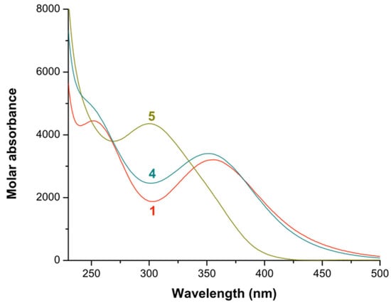 Calculated electronic spectra of the iron(III)–1,3-propanediamine species in methanol. (1) Fe3+; (4) [Fe(pn)]3+; (5) [Fe(pn)2]3+.