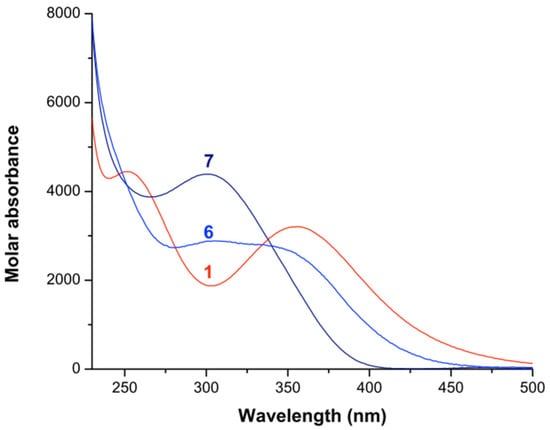 Calculated electronic spectra of the iron(III)–1,4-butanediamine species in methanol. (1) Fe3+; (6) [Fe(bn)]3+; (7) [Fe(bn)2]3+.