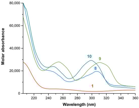 Calculated electronic spectra of the mono complexes with Fe3+ and bipy, dmbipy, and dtbbipy in methanol: (1) Fe3+; (8) [Fe(bipy)]3+; (9) [Fe(dmbipy)]3+; (10) [Fe(dtbbipy)]3+.