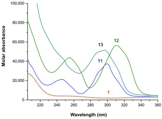 Calculated electronic spectra of the bis complexes of Fe3+ and bipy, dmbipy and dtbbipy in methanol. (1) Fe3+; (11) [Fe(bipy)2]3+; (12) [Fe(dmbipy)2]3+; (13) [Fe(dtbbipy)2]3+.