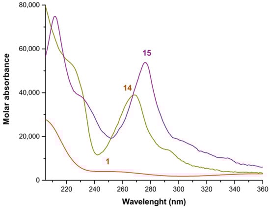 Calculated electronic spectra of the mono complexes of Fe3+, phen, and tmphen in methanol: (1) Fe3+; (14) [Fe(phen)]3+; (15) [Fe(tmphen)]3+.