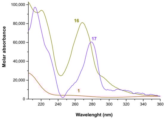 Calculated electronic spectra of the bis complexes of Fe3+ with phen and tmphen in methanol: (1) Fe3+; (16) [Fe(phen)2]3+; (17) [Fe(tmphen)2]3+.