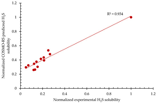 Normalized COSMO-RS-predicted H2S solubility vs. normalized experimental H2S solubility.