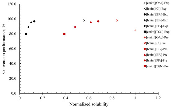 Furthermore, the normalized experimental H2S solubility and normalized COSMO-RS-predicted H2S solubility values in ILs were plotted against the conversion ratio of H2S to elemental sulfur in order to establish a correlation between H2S capture and H2S conversion by ILs. The establishment of the correlation allows the utilization of COSMO-RS for the preliminary prediction of the conversion performance of H2S to elemental sulfur in ILs. The conversion ratio value was taken from the literature [35].