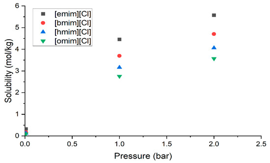 Effect of alkyl chain length of cation on the solubility of ILs at various pressures and 25 °C.