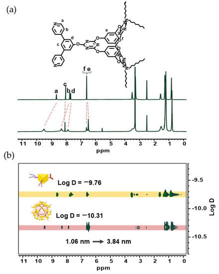 After the dissolution of COC ligand in CDCl3 and Pd(NO3)2 in DMSO-d6, respectively, the two solutions were mixed at 50 °C for 12 h, from which the quantitative self-assembly of a single product was detected by 1H-NMR spectroscopy (see Supplementary Materials Figures S3 and S4). As shown in Figure 1a, only one set of ligand signals was observed, indicating a discrete and highly-symmetric structure of VCH. The characteristic broadened resonance signals also confirmed giant species formation, the motion of which was dynamically slow on the NMR time scale. Besides, some signals from protons adjacent to the pyridyl nitrogen atom exhibited distinct downfield shift (Δδ = 0.85–0.035 ppm for Ha, Hb, Hc, Hd), indicative of the coordination with metal ions.