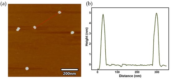 To detect the morphology and size of the obtained VCH, we performed a transmission electron microscopy (TEM) experiment by placing a drop of VCH solution in THF (about 0.2 mg/mL) on a copper grid. It was shown that the VCH were discretely and compactly spherical nanoobjects with a uniform diameter of about 4.0 nm (see Supplementary materials Figure S7). The result was consistent with the value calculated from the Stokes−Einstein equation. An AFM image was obtained by spin-casting a highly diluted THF solution of VCH (10 ng/mL) on freshly cleaved mica substrate. A clear AFM image was obtained showing discrete spherical-shaped particles with a uniform height of 4.9 nm above the surface, as shown in Figure 2. This also revealed the stability of the complex under AFM conditions. However, because of the unavoidable tip broadening effect [34], the measured widths of the dots were slightly larger than that from TEM measurement.