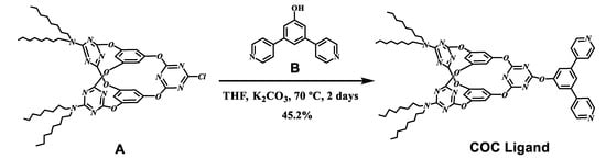 The COC ligand was synthesized through a substitution reaction according to the Scheme 2. Functional cage, compound A, was synthesized according to our previously reported method [16]. Compound A (0.22 g, 0.22 mmol, 1.0 eq.), Compound B (60.35 mg, 0.243 mmol, 1.1 eq.) and K2CO3 (39.47 mg, 0.286 mmol, 1.3 eq.) were added in tetrahydrofuran (THF, 150 mL) and the mixture was refluxed at 70 °C for 48 h. Then, the solvent was removed under reduced pressure. The residue was subjected to column chromatography with CH2Cl2:CH3OH (100:1, v/v) as eluent to afford the COC ligand as a white solid (0.12 g, yield 45.2%). 1H NMR (400 MHz, CDCl3) δ 8.66 (d, J = 3.8 Hz, 4H), 8.03 (s, 1H), 7.75 (d, J = 4.8 Hz, 4H), 7.69 (s, 2H), 6.60 (s, 2H), 6.59 (s, 4H), 3.50 (t, J = 7.4 Hz, 8H), 1.57 (br, 8H), 1.27–1.23 (m, 40H), 0.83 (t, J = 2.66 Hz, 12H). 13C NMR (100 MHz, CDCl3) δ 174.28, 174.16, 172.12, 167.49, 153.55, 152.77, 152.44, 150.51, 146.84, 141.12, 123.88, 121.79, 120.82, 116.14, 114.62, 47.66, 31.83, 29.43, 29.29, 27.61, 26.89, 22.68, 14.12. MS (MALDI TOF): Calculated for C69H85N13O7, [M+H]+ 1208.6695, found 1208.6726.