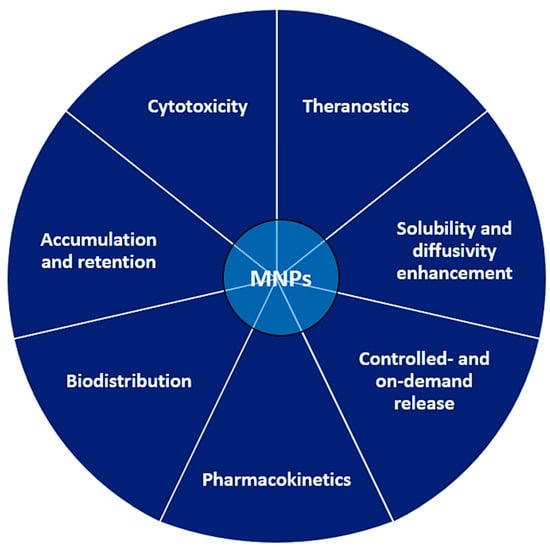 Despite impressive achievements during the 21st century, life expectancy is still low in many countries, and a common and rising leading cause of serious health problems and ultimately death is the occurrence of cancer, which is believed to eventually be responsible for roughly 1.3 million deaths in 2022 in the European Union alone [215]. Various tumors and cancers were triggered by MNP formulations [216,217,218,219], and a breakthrough was the transition of MNPs from fundamental research to viable options in oncologic treatment [220], theranostic applications [221,222] and drug-delivery systems [98,223,224] (Figure 3).