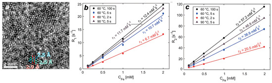 (a) HRTEM magnification image of ultra-small IONPs matching the [111] zone axes of magnetite with the two 2.5 Å (113) planes and one 2.9 Å (220) plane (PDF ref. 03-065-3107); (b) Relaxation rates R1 (longitudinal) and (c) R2 (transversal) vs. iron concentration in the (consecutively diluted) dialyzed samples (CFe) to determine r1 and r2 (i.e., the slope) for IONPs synthesized at co-precipitation temperatures and quenching times as indicated. Reprinted/adapted from ref. [139], under a Creative Commons Attribution 3.0 Unported Licence.