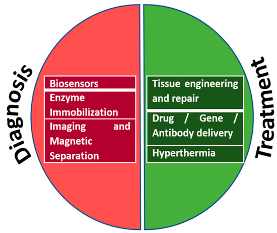 Antibody immobilization on MNPs can yield powerful sensing platforms [225]. Many biomedical applications including cancer and tumor cell treatment have been reported [226,227,228,229,230,231]. Applications of MNPs in medicine and particularly nanomedicine have been reviewed recently in the literature [232,233,234,235].