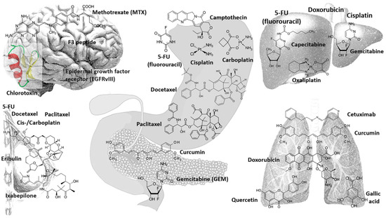 Efficient delivery of drugs by MNP-coated nanocomposites requires a thorough knowledge of the proteic behavior of the drug molecule [247,248,249]. Pharmacokinetic behavior is of utmost importance since it can lead to better drug administration and by this, to more efficient disease treatment and management [250,251]. Drugs, genes and other biologically relevant molecules can be conjugated with NPs for efficient delivery at the targeted site (MDT, magnetic drug targeting). Drug-delivery applications have gained momentum and many reports have surfaced, dealing with a variety of problematic-to-target-and-cure types of cancer or disease [96,239,252,253,254,255,256,257,258,259,260,261,262]. A summary of the most commonly used anticancer drugs is depicted in Figure 4, with their chemical formulas (where space allowed it) and associated brand-name; the following organs were chosen—brain, stomach, pancreas, liver, breast and lung (Figure 4).