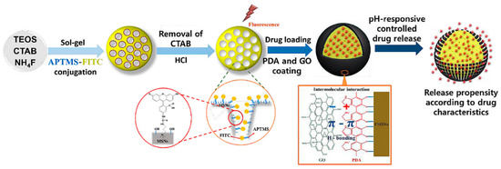 Schematic snapshots illustrating the fabrication process of MSNs grafted with APTMSFITC conjugates, followed by coating of the PDA and GO double layer, and their controlled drug release mechanism. Reprinted/adapted from ref. [321] with permission from RSC—Royal Society of Chemistry, 2020.