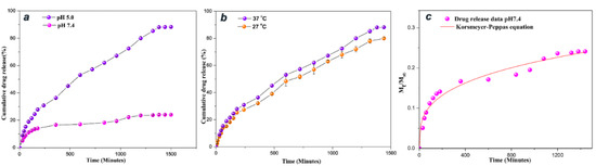 (a) pH responsive 5 FU release profile of 5 FU-loaded Fe3O4-Dex-MA-g-P(NVI/NVCL) at 37 °C at pH of 5.0 and 7.4. Data are presented as mean ± SD (n = 3); (b) In vitro 5 FU release of profile of 5 FU-loaded Fe3O4-Dex-MA-g-P(NVI/NVCL) at pH 5.0, temperatures 27 and 37 °C. Data are presented as mean ± SD (n = 3); (c) Korsmeyer–Peppas fit for 5 FU release from 5 FU-loaded Fe3O4-Dex-MAg-P(NVI/NVCL) at pH 7.4. Reprinted/adapted from ref. [322] with permission from Elsevier, 2020.