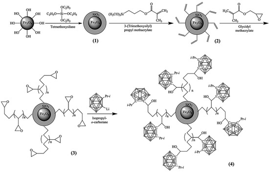 Functionalization scheme for Fe3O4 MNPs with carborane immobilization. Reprinted from ref. [354], with permission from Elsevier, 2020.