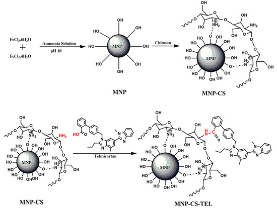 Another typical example depicting MNPs formation is coating with biocompatible chitosan (MNP-CS) and further binding Telmisartan (an anticancer drug that is water-soluble and contains carboxyl -COOH moieties) (Figure 9).