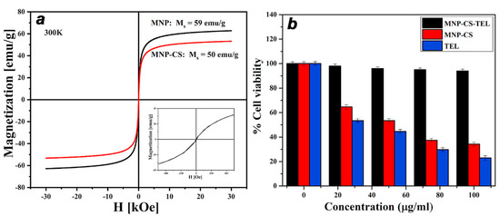 (a) Room temperature magnetization curves of MNPs and MNP-CS. (b) In vitro cytotoxicity assay of MNP-CS, MNP–CS–TEL, and TEL on PC-3 human prostate cancer cell line by MTT assay. Reprinted from ref. [366], with permission from Elsevier, 2021.