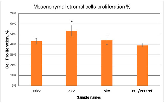 The hMSC proliferation results in PCL/PEO-Ti0.5-Ag-15 kV (denoted 15 kV), PCL/PEO-Ti0.3-Ag-8 kV (denoted 8 kV) and PCL/PEO-Ti0.3-Ag-5 kV (denoted 5 kV) and PCL/PEO-ref. Data presented as mean ± std. * Statistical significance is p < 0.05.