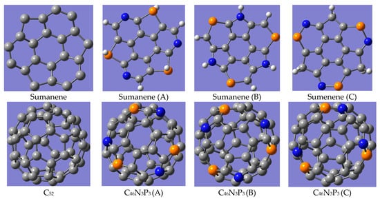 The second part of this study deals with the evaluation of four fullerenes as nanocarriers for these phthalocyanines. We employed an all-carbon fullerene (C52) and three fullerenes doped with nitrogen and phosphorus atoms (C46N3P3) with different substitution patterns. The heteroatomic substitution pattern is depicted below for both sumanene, a circulene-type precursor of fullerene C52, and the corresponding fullerenes. Our previous studies have dealt with the evaluation of the properties and aromatic characteristics of various all-carbon and nitrogen- and phosphorus-doped nanostructures, including both fullerenes and their polycyclic aromatic hydrocarbon (mostly coronene and sumanene) precursors [19,20].