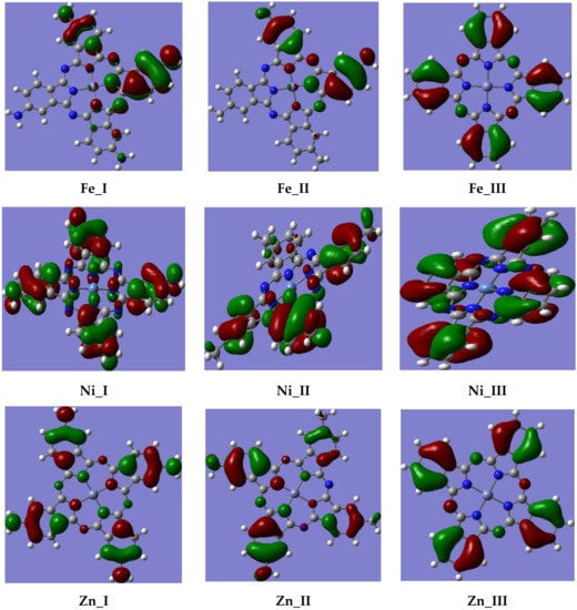 - The energies of the frontier molecular orbitals HOMO and LUMO are very slightly influenced by the type of the metal; as a result, the calculated global reactivity parameters presented in Table 1, Table 2, Table 3 and Table 4 have similar values among the same substitution type, regardless of whether the metal is iron, nickel, or zinc;