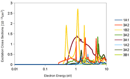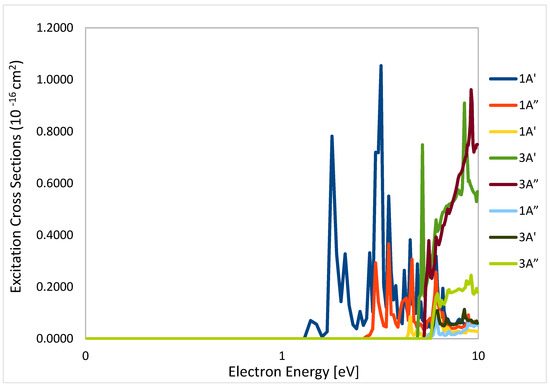 The DEA cross sections are presented in Figure 8, simulated with different electron affinity for comparison in the spectrum changes. The values used for the electron affinity of the negative ions of Cr(CO)6 are expected to be higher than the specified value in [39] of 1.6 eV. The DEA cross section maximum value is in the range of ~4.3 × 10−15 cm2 at 0.2 eV for the Cr(CO)5− fragment, for a value of electron affinity of 1.6 eV and vibrational frequency of 2000 cm−1 for a dissociation electron energy value of 0.1 eV. The value of cross-sections reported by [25] is of 1.85 Å2 to 3.29 Å2. The ground state configuration used in our Quantemol-N calculations in 1A1 state is D2h. The final assigned states for the DEA process as a result of the calculations from the initial 1Ag state are: 3B1u, 1B1u, 3Au, 1Au with 5 symmetry states (Table 6). From Quantemol-N simulations the resonances from our active space are: 2Ag (4.86 eV), 2B3u (9.04 eV), 2B2u (9.04 eV), 2B1g (8.1 eV), 2B1u (8.1 eV), 2B2g (8.3 eV), 2B3g (8.3 eV) and 2Au (6.7 eV).