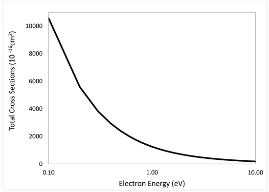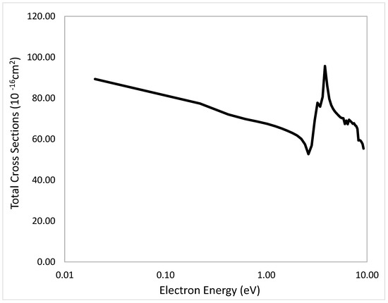 The total cross-sections of Co(CO)3NO (Figure 4) has a maximum of the cross-section at 0.1 eV and a value of 10,560 × 10−16 cm2 and decreases asymptotically to 10 eV to a value of 184.2 × 10−16 cm2. Convex inflexion points in the cross-section distribution spectrum are observed at a value of the electron energy of 0.2 eV and a value of the cross-section of 5589 × 10−16 cm2, and at 0.3 eV and a total cross-section value of 3822.59 × 10−16 cm2.