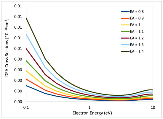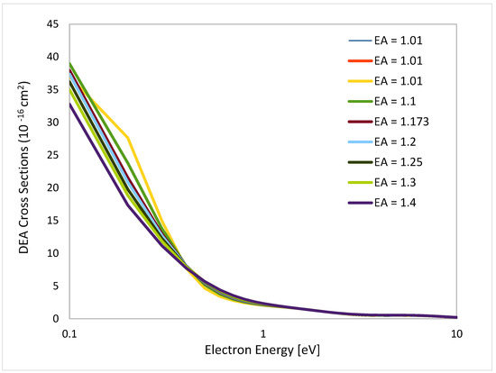The maximum of the cross section is in the range of 4.5 × 10−16 cm2 at 0.1 eV corresponding to the Co(CO)2NO− fragment [24]. The individual peaks in the DEA cross section graph (Figure 5) are corresponding to the individual fragment dissociation, and are close in energy to the values we found in the literature. The maximum cross section value changes with the vibrational frequency. The purple (color) (Figure 3) curve is close to reality, presenting a clean peak at a vibrational frequency of 0.53 Å2 and 1.173 eV electron affinity.