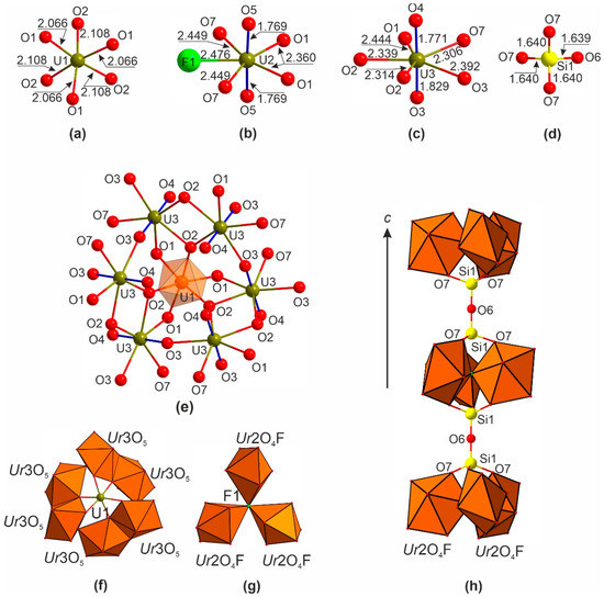 Cation coordination (a–d) in the structure of Cs[(UO6)2(UO2)9(Si2O7)F]. Linkage of the Ur(3)O5 and U1O6 in the ball-and-stick (e) and polyhedral representation (f) (the uranyl bonds are shown in blue). Linkage of the Ur(2)O4F polyhedra sharing common F atom in the center thus forming Ur(2)3O12F trimers (g). An arrangement of the Si2O7 and Ur(2)3O12F groups along the c axis (h).