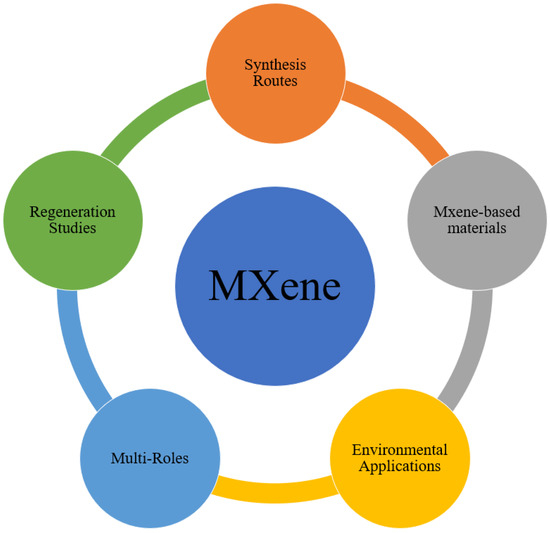 MXene-based nanomaterials are attracting researchers’ interest for use in various disciplines due to their low cost of manufacturing and use and environmental friendliness. Figure 11 depicts MXene-based nanomaterials’ use to remove several contaminants. Different dyes such as methylene blue (MB), saffranine T (ST), neutral red (NR), antibiotics, heavy metals, and phenolic compounds are hazardous to the atmosphere and community. MXene-based nanomaterials’ active surface area, layered structure, and charged surface aid in removing hazardous substances from aqueous solutions. Several heavy metals, such as Pb(II), Cu(II), Cd (II), Cr(IV), and Hg(II), are inorganic and organic chemicals that are difficult to break down and accumulate in living things. MXene-based nanoparticles are used in this application because they include oxygen-containing groups and have a more extensive surface area for removing irons from effluent perfectly. Human respiratory infection and other health problems are caused by wastewater and certain volatile organic chemicals. MXene-based nanomaterials’ features, such as high adsorption energy and selectivity, help to remove toxic organic chemicals and hazardous water pollutants. Pu ions, uranium (II), and Neptune (Np) are radioactive constituents that are radiologically and chemically hazardous. They pollute the environment with nuclear waste. MXene-based nanomaterials are used to eliminate these radioactive materials because of their remarkable ability to resist higher radiation and good chemical compatibility. MXene-based nanomaterials also remove contaminants such as phosphates in the water, phenol, and highly charged cations, owing to their active surface morphology.
