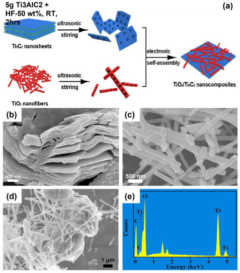 (a) Schematic description for the synthesis of M-MXene/TiO2 composite SEM images of (b) TiO2, (c) MXene, and (d,e) MXene/TiO2 nanofibers. (Reprinted with permission from Ref. [17]. 2019 Elsevier).