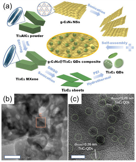 - Li, Y.; Ding, L.; Guo, Y.; Liang, Z.; Cui, H.; Tian, J. Boosting the Photocatalytic Ability of g-C3N4 for Hydrogen Production by Ti3C2 MXene Quantum Dots. ACS Appl. Mater. Interfaces 2019, 11, 41440–41447. [Google Scholar] [CrossRef]
