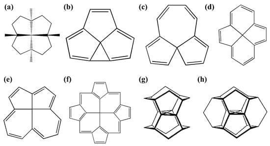 In addition to the electronic approach, ptC structures can be designed by generating enough strain to keep the carbon forcefully in planar orientations, and this method is called the “mechanical strategy”. In this particular approach, to generate sufficient strain, cylindrical cages or tubes, small rings, and annulenes are helpful agents [41,42,43,44,45,46,47]. Although some species with ptC were designed theoretically by using this strategy, no experimentally characterized ptC structures based on this strategy have been reported. Following this strategy, some of the computationally predicted ptC species are shown in Figure 1. To achieve ptC structures based on this approach, the fenestrenes and the aromatic unsaturated fenestrenes, rigid 3D cages, such as octaplane, were proposed initially [48,49]. In 1999, Ding et al. noted that “despite considerable computational efforts no structures with a planar tetracoordinate C(C)4 substructure have been found” [50]. However, Rasmussen et al. computationally reported the first successful ptC structure based on this strategy by adjusting the 1g structure to generate 1h (Figure 1) geometry in which the ptC atom is stabilized in a strained environment [44,51]. With the use of a similar strategy, Wang and Schleyer reported a set of boron spiroalkanes with a planar C(C)4 moiety through the replacement of carbon by boron atoms [20,52].