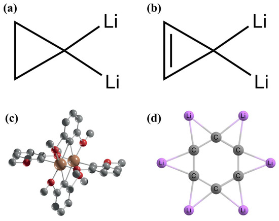 Optimized geometries of (a) 1,1-dilithiocyclopropane and (b) 3,3-dilithiocyclopropene systems. (c) The molecular structure of V2(2,6-dimethoxyphenyl)4 features a V≡V triple bond and two planar tetracoordinate carbon (ptC) centers. The H atoms are omitted for clarity. (d) Optimized D6h symmetric structure of C6Li6.