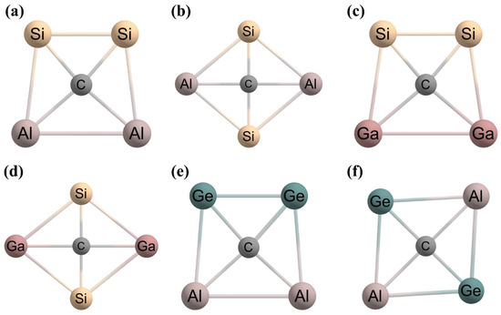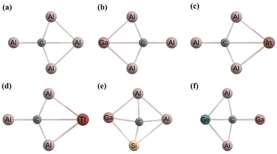 The local minimum structures of (a) CAl4, (b) CAl3Ga, and (c) CAl3In clusters. The global minimum structure of (d) CAl3Tl, (e) CSiGaAl2, and (f) CGeGaAl2 clusters with ptCs.