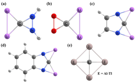With the use of Li as ligand atoms, a series of ptC species can be adapted [19]. For example, the replacement of the CH2 group in the 1,1-dilithiocyclopropane (Figure 2a) molecule by isoelectronic NH and O generates ptC structures 4a and 4b, respectively (Figure 4). The 4c and 4d ptC structures are also generated by attaching 4a to a heterocyclic system and a benzene ring, respectively. These 4c and 4d species are more viable targets due to the dominance of the aromaticity of imidazole.