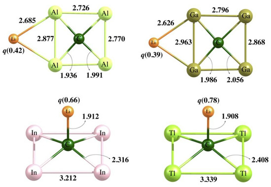 Lowest-energy structures of the CE4Li− clusters (E = Al, Ga, In, Tl), respectively, calculated at the B3LYP/def2-TZVP level. Bond lengths are given in Å. (Reprinted from ref. [57] with permission from Elsevier. Copyright © 2022 Elsevier B.V.).