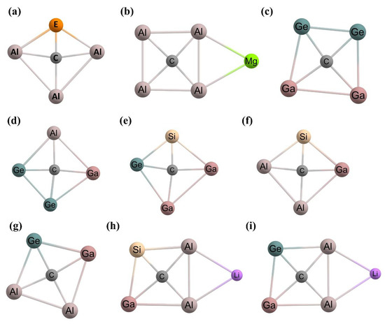 (a) Global minimum structures of the CAl3E (E = P, As, Sb, Bi) clusters. (b) The global minimum structures of CAl4Mg and CAl4Mg− clusters. The neutral and anionic forms have the same shape but different bond lengths. The minimum energy structures of (c) CGa2Ge2, (d) CAlGaGe2, (e) CSiGa2Ge, (f) CSiGaAl2−, (g) CGeGaAl2−, (h) Li@SiGaAl2, and (i) Li@GeGaAl2 clusters.