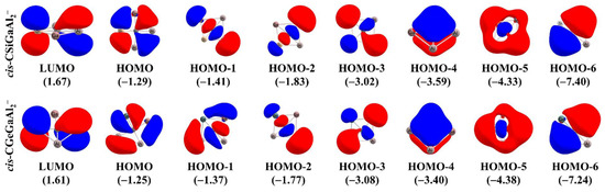 Plots of the molecular orbitals of the global minimum structures of CSiGaAl2− and CGeGaAl2− clusters. The values in the parentheses are the energies of the corresponding orbitals in the eV unit at the PBE0-D3/def2-TZVPP method.