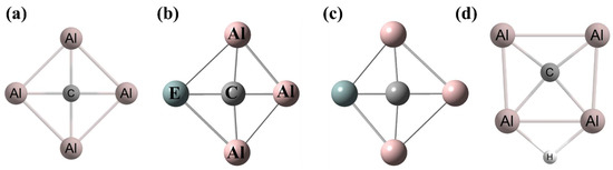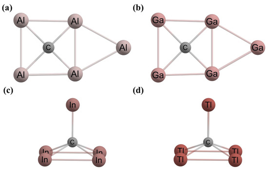 In 2018, Zheng et al. designed CAl3X (X = Al/Ga/In/Tl) neutral clusters with 16-valence electrons [91]. The exploration of the PES indicated that for CAl4 (Figure 10a) and CAl3Ga (Figure 10b) clusters, the global minimum geometries are tetrahedral with 8.70 and 3.66 kcal mol−1 lower energy than the corresponding ptC isomers, respectively. For the CAl3In cluster (Figure 10c), the tetrahedral isomer is slightly more stable than the ptC isomer by only 0.69 kcal mol−1. Favorably, for the CAl3Tl cluster (Figure 10d), the ptC global minimum has 1.01 kcal mol−1 lower energy than the tetrahedral isomer. Hence, only for the CAl3Tl system, the global minimum structure corresponds to the ptC isomer. Moreover, this ptC isomer has 20 kcal mol−1 lower energy than the lowest-energy triplet isomers [91]. Despite the 16-valence electronic cluster, it still shows π-aromaticity. The authors suggested that the ionic [CAl3−]X+ plays a major role in the competition between tetrahedral and planar isomers of the clusters.
